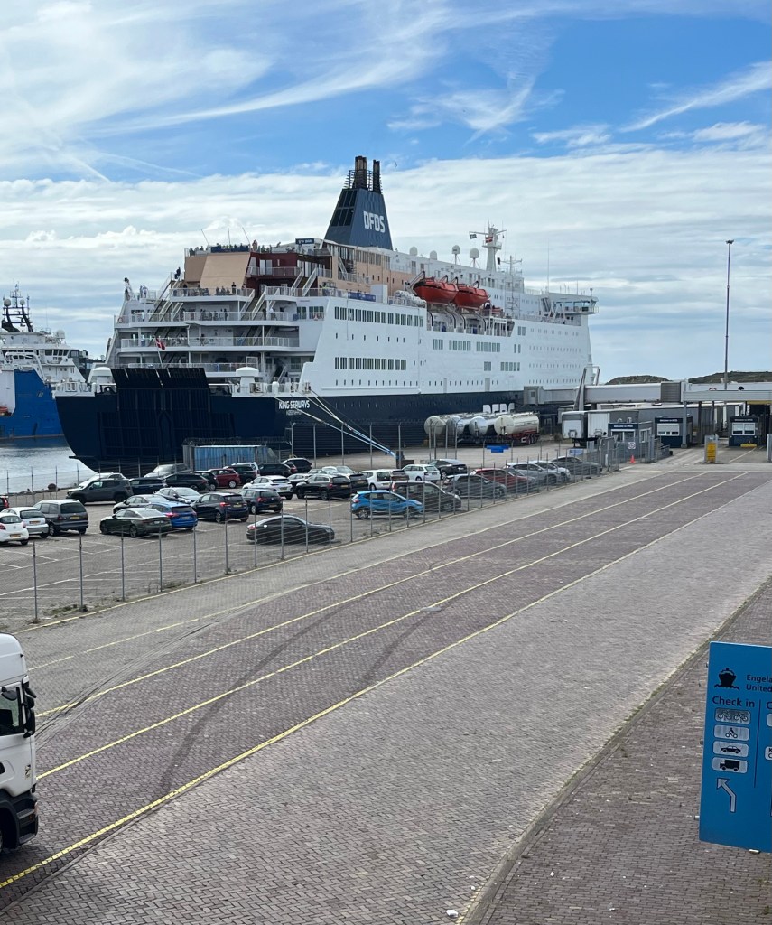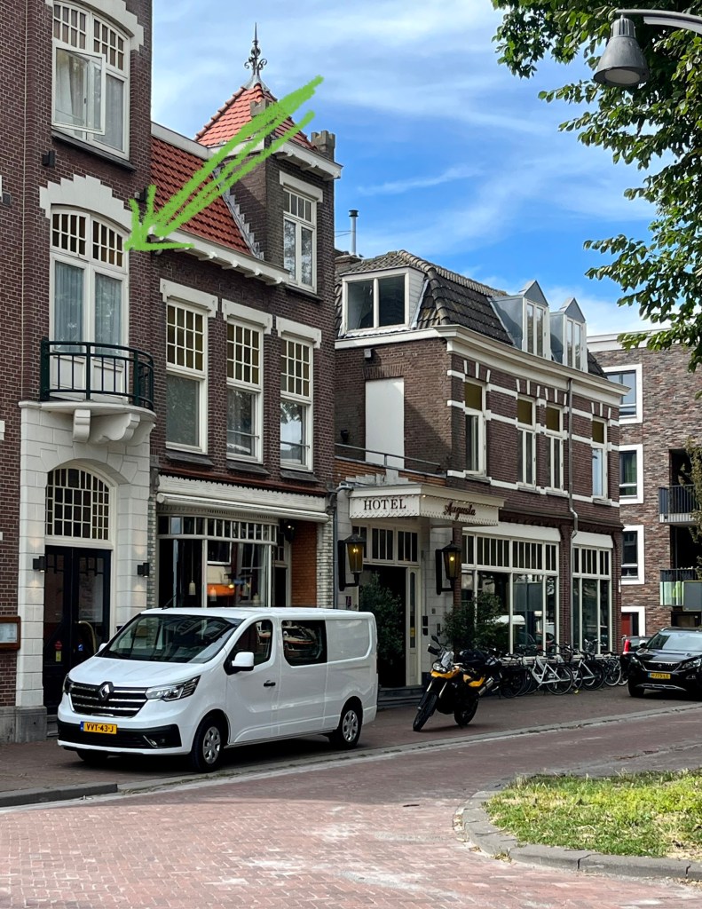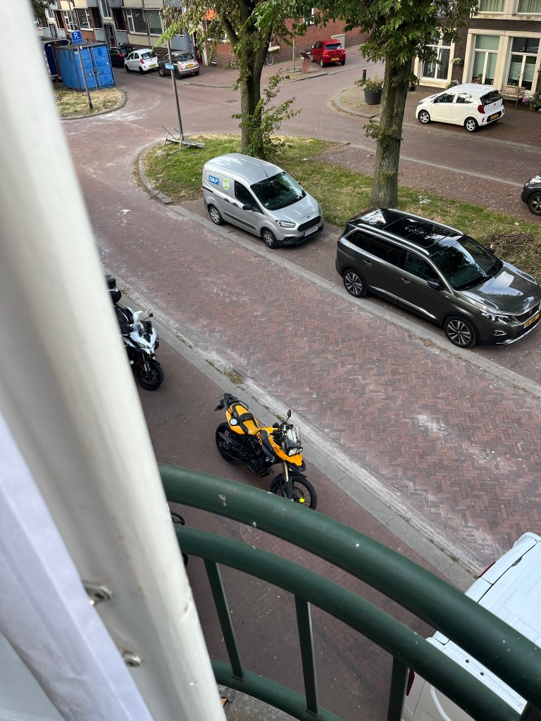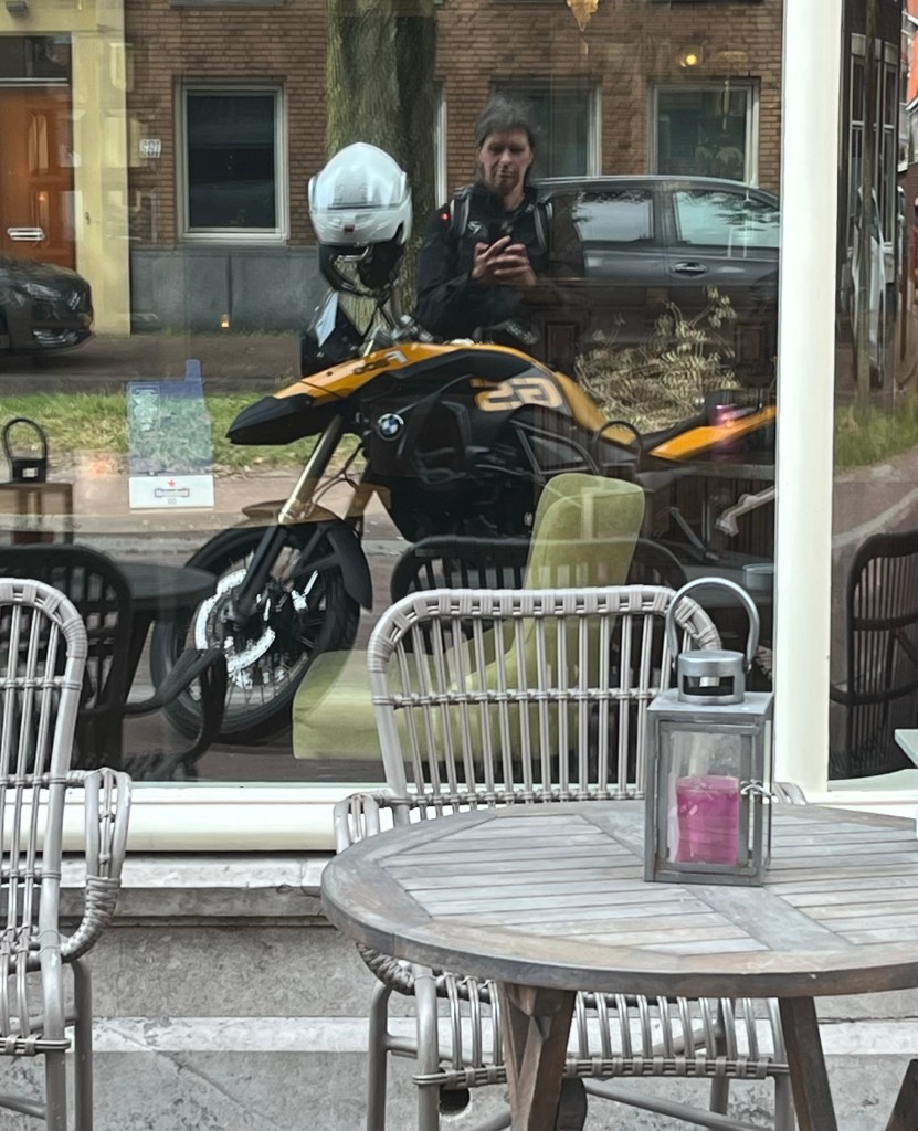 Kurz vor Amsterdam wird es 5- und 6-spurig – Wahnsinn, aber dennoch alles ganz übersichtlich und gut zu finden, denn mein kleines Hotelchen in der (natürlich) Oranjestraat ist ganz nah am Fährableger …also außerhalb von Amsterdam in Ijmuiden. Und ich kann direkt vorm Haus parken, hab ein klitzekleines Zimmer, aber den einzigen Balkon, von dem ich mein Motorrad sehen kann.
