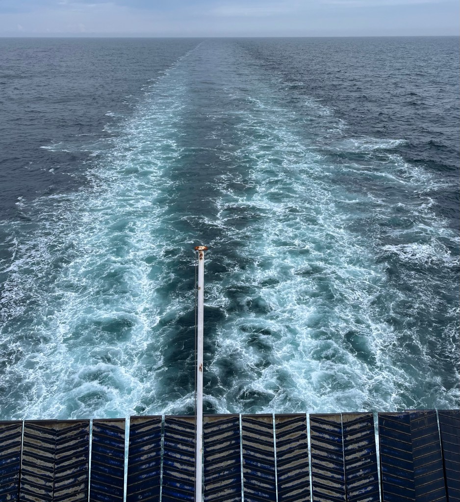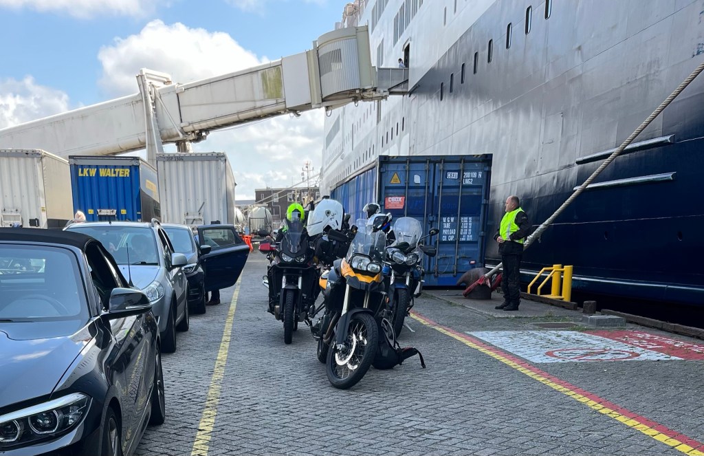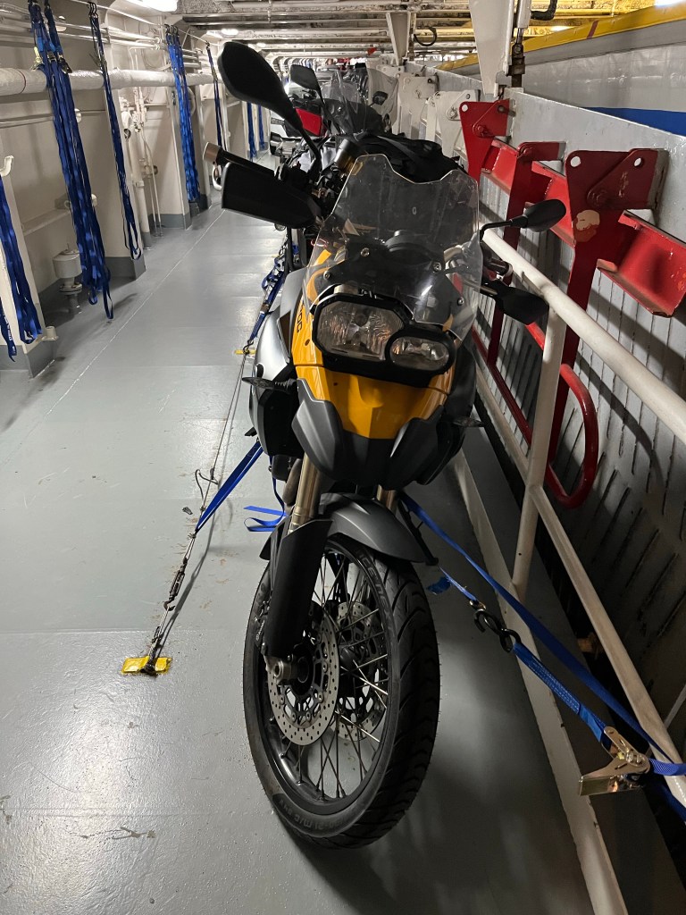 Im Hafen bin ich das erste Motorrad, aber dann gehts weiter …2 Männer aus UK, ein Paar aus den NL, ein Mann aus Oldenburg usw. – ich fahre also allen voran aufs Schiff und stell mich auch innerlich gar nicht mehr so an. Das Verzurren geht auch – trotzdem helfen die beiden älteren Briten 😊 (Sollen wir hier eigentlich alle wieder rückwärts runter? 😳 – oh, da is die sorgenvolle Stimme wieder)