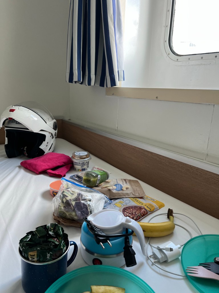 Mein Kabinchen ist allein super und ich hab alles dabei – sogar nen faltbaren Wasserkocher – dank meiner langjährigsten Freundin Silke, die einfach weiß, was wichtig ist.