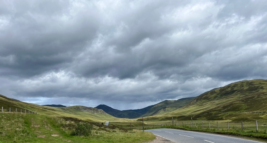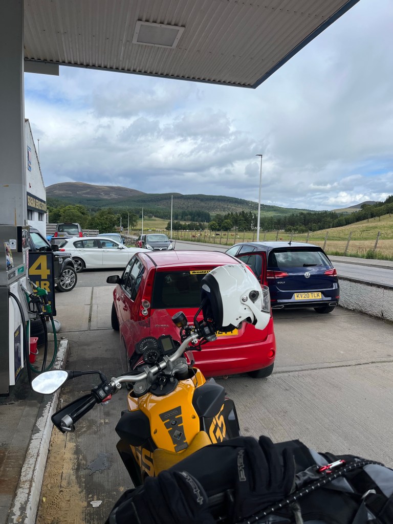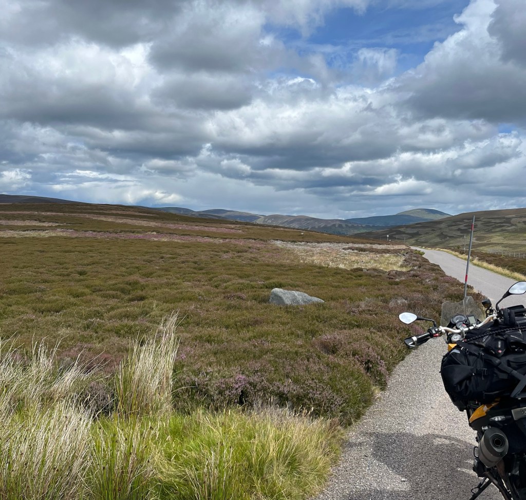 In Braemar muss ich tanken, aber es gibt nur Diesel und E10 – hoffentlich verzeiht mir die Blonde E10 …sie kriegt dafür heute Öl auf die Kette. Hier in der Nähe ist Schloß Balmoral, wo die Queen so gern war und im letzten Herbst auch gestorben ist. Aber das schenke ich mir – soll voll und teuer sein für einen Blick in den Park. Dafür noch ein schönes Cafe am Weg und weiter herrliche Ausblicke.