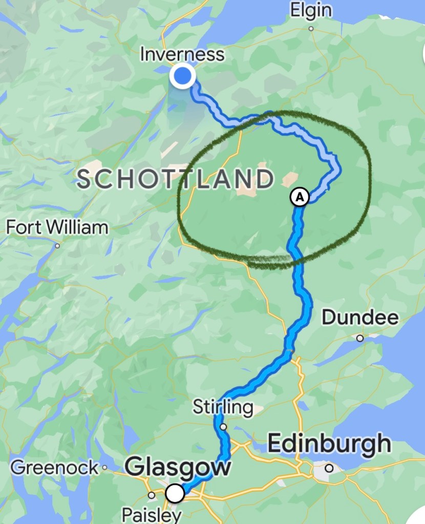 Ein langer Tag geht zu Ende. Von Glasgow nach Inverness durch den Cairngorms Nationalpark zieht sich, v.a. dann in den Highlands hügelig, kurvig und auf z.T. sogenannten Singletracks, auf denen man sich mit dem Gegenverkehr einigen muss, wer jetzt in der Ausbuchtung auf wen wartet.