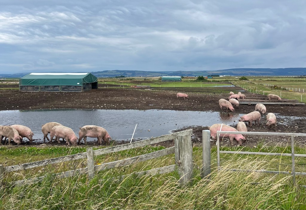 Ich finde den Weg an der Küste Richtung Forres und staune über Schweine-Weiden.