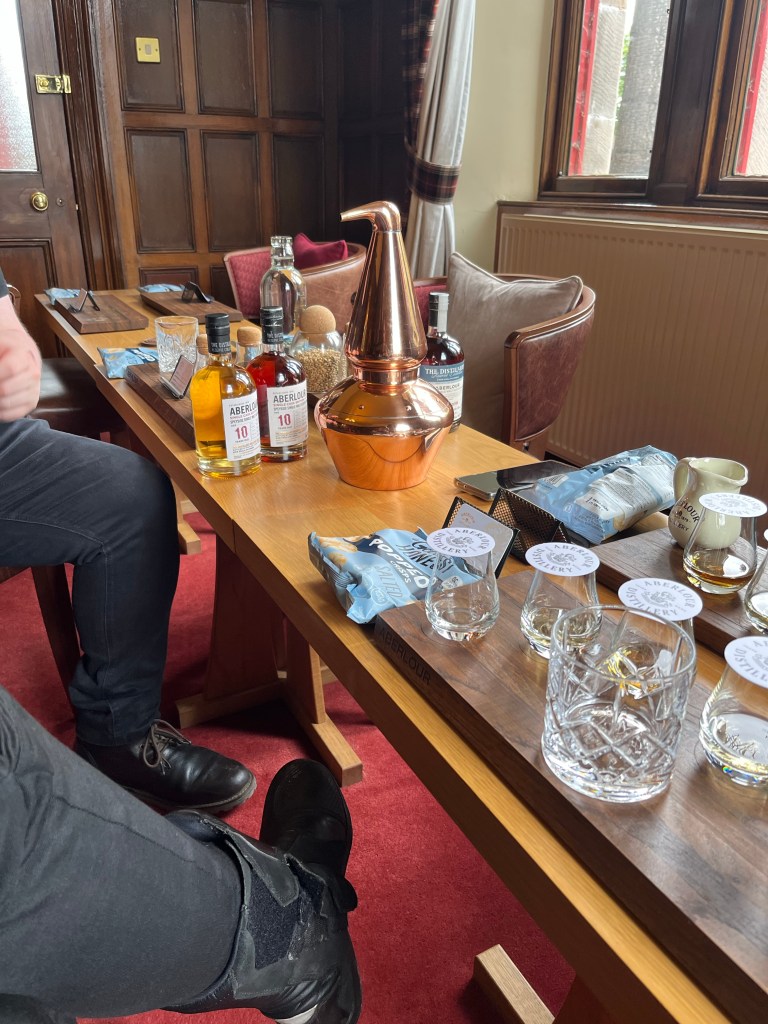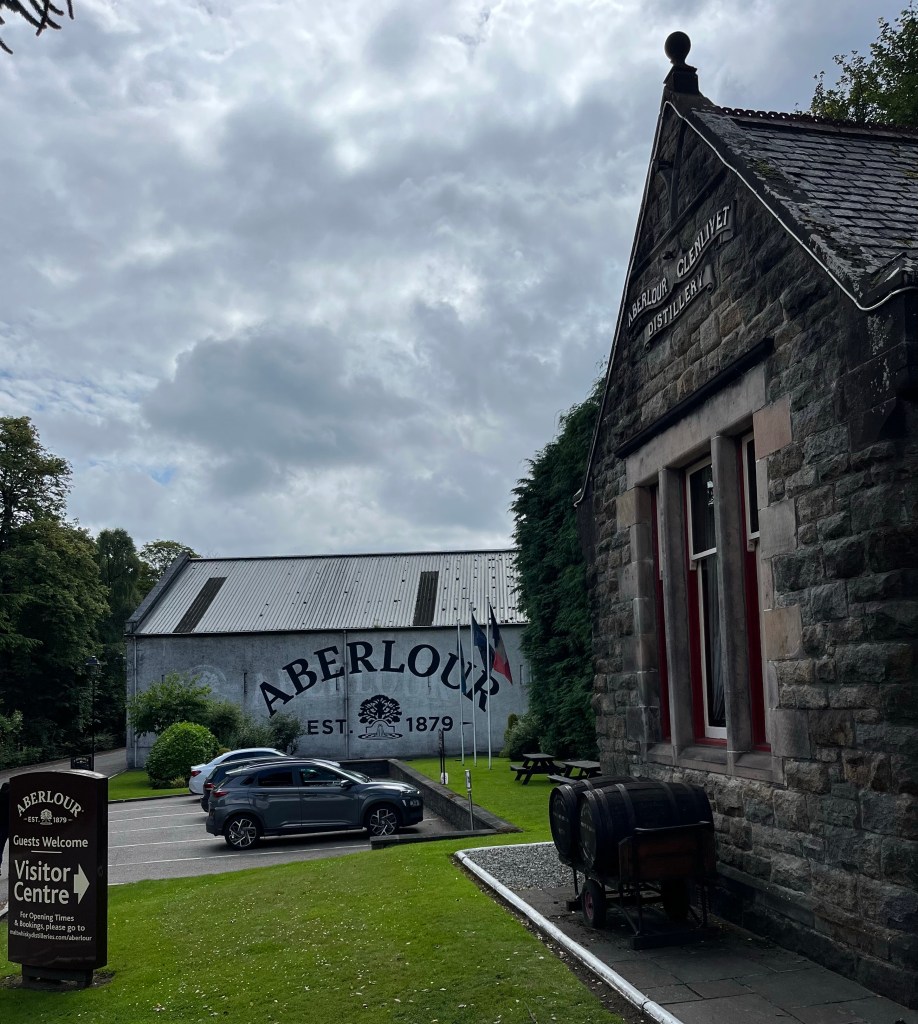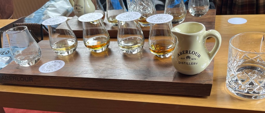 Ich bin kurz nach 11 am Hotel. Zum Einchecken viel zu früh, aber ich darf Helm und Rucksack da lassen. Überpünktlich bin ich in der Destillery und zur Verkostung sind wir nur zu dritt – der junge Whisky-Profi und noch ein sehr junger Asiate (ist der überhaupt schon 18?), der besser Englisch kann als ich (was nicht schwer ist). Der Profi sorgt sich aufgrund meiner Motorradklamotten auch darum, dass ich nach dem Tasting nicht mehr fahre – is doch klar. Das Ganze findet in einem schönen Raum statt und ich versteh fast alles und lerne was über Whiskyentstehung und Lagerfässer. Die schon mal gebrauchten …also die nachgefüllten Fässer nehmen dem Whisky die Schärfe und machen ihn schmeckbar sanft. Wir probieren 10jährige, einen 15jährigen, einen 18- und einen 21jährigen Aberlour (bislang hab ich nur höchstens 8jährige getrunken und war schon von denen angetan).