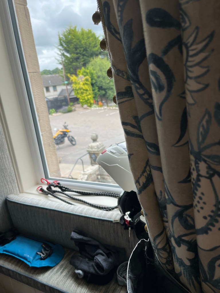 Ich lass es mir mit den Restpröbchen an diesem schönen Ort noch gut gehen und muss mir dann für morgen mal etwas wärmere Sachen raussuchen. Leider ist es nicht gelungen, Whisky zu kaufen und zu verschicken – das ist verboten und in meiner nur 30l-Tasche noch was mitnehmen, wird nix. Da ist noch Öl, Kettenspray, ne Powerbank fürs Motorradstarten (also was Größeres) drin …bissl Outdoorfood für die Inseln und nen Kocher. Die Klamotten halt ich eh sparsam …und muss unter der Dusche immer gleich mal was mit auswaschen.